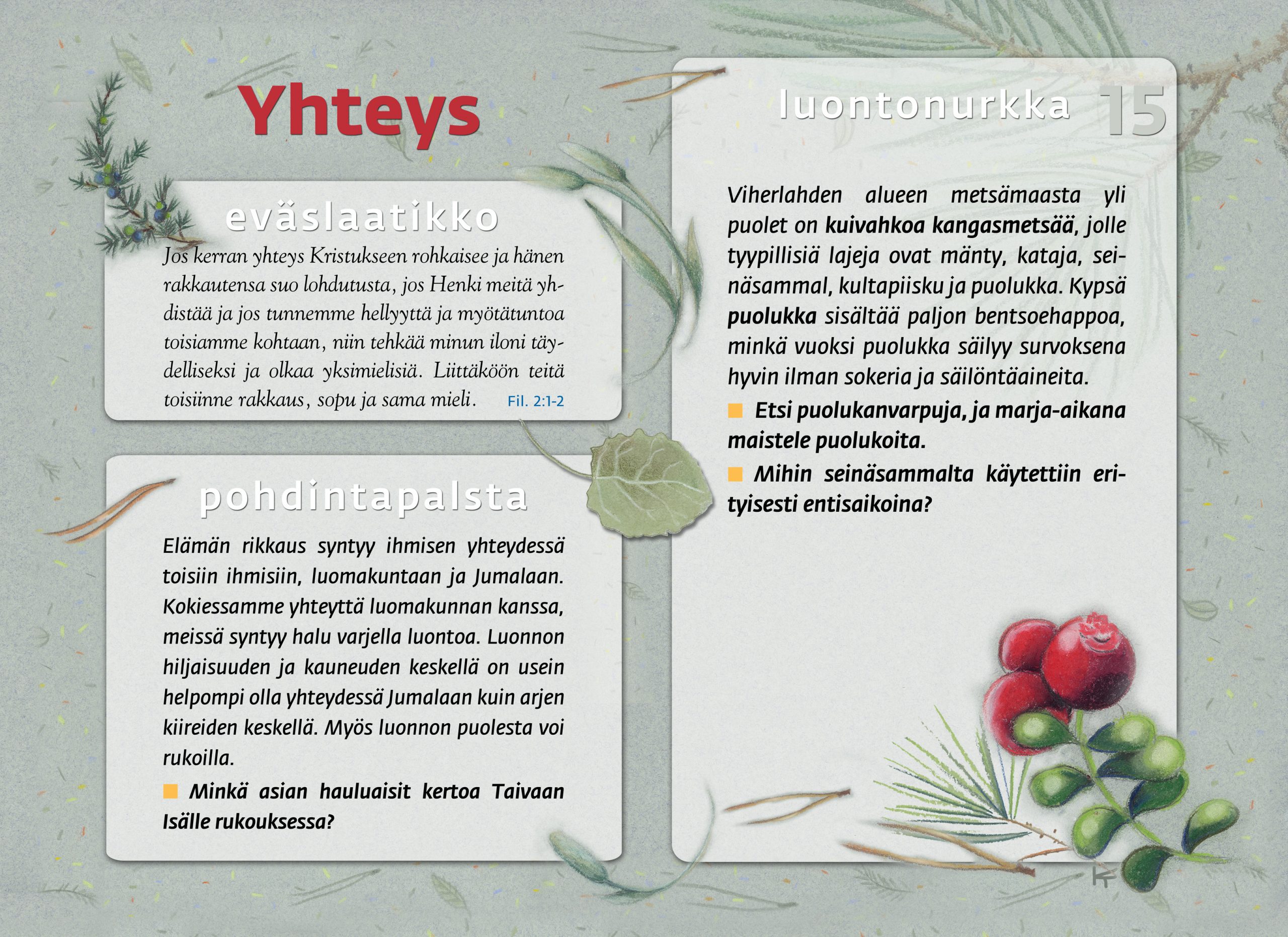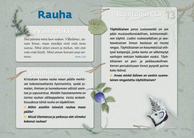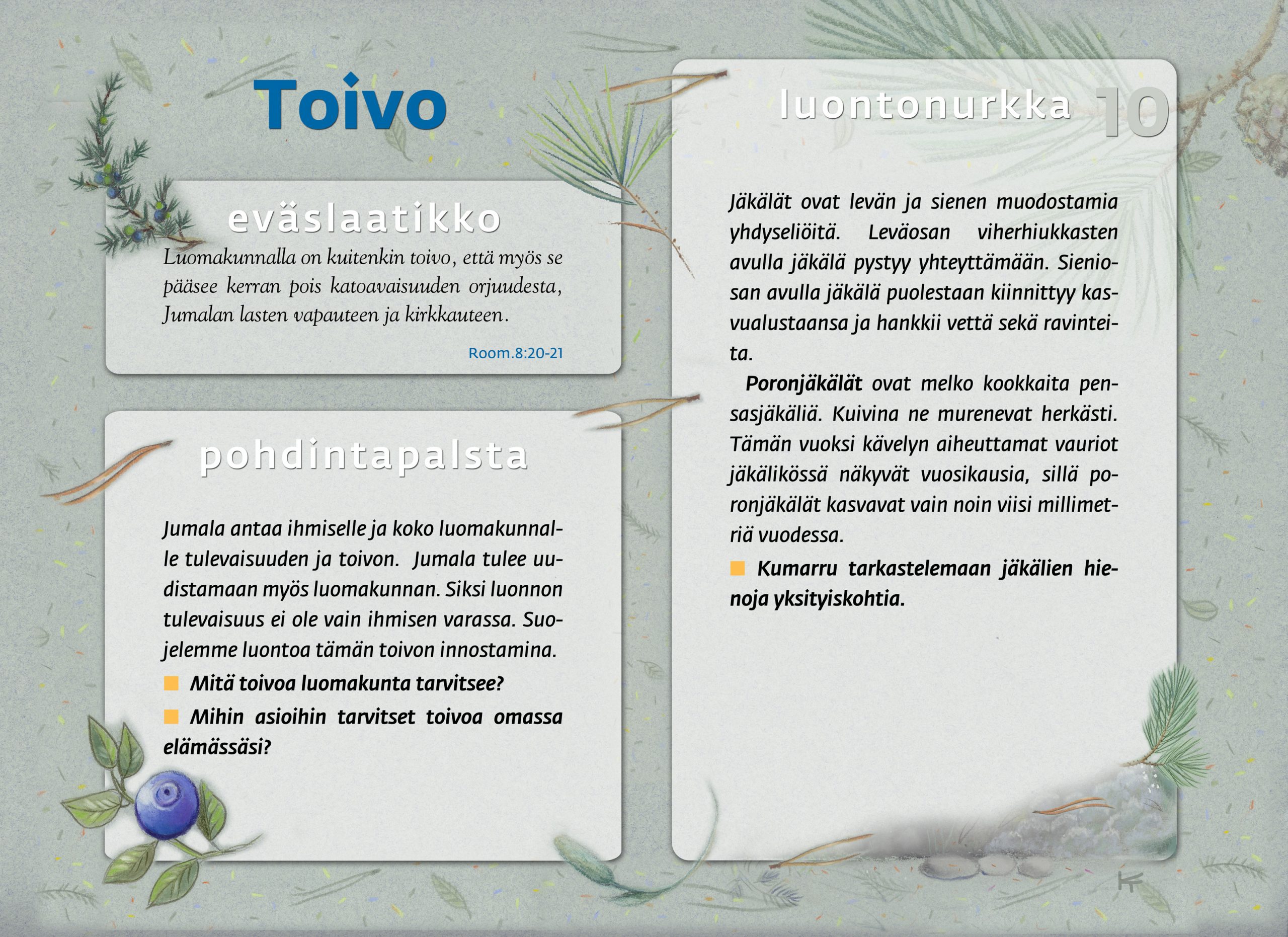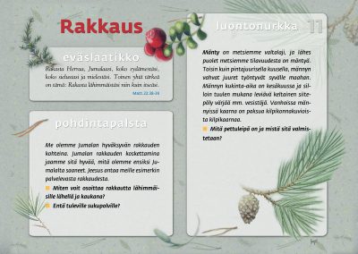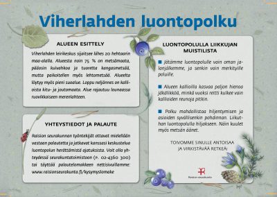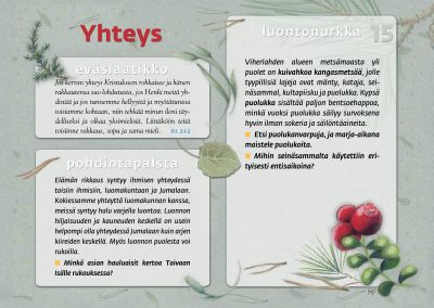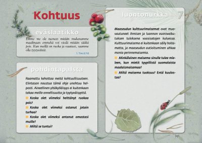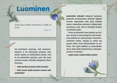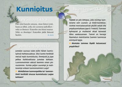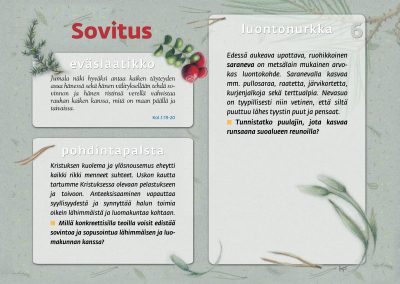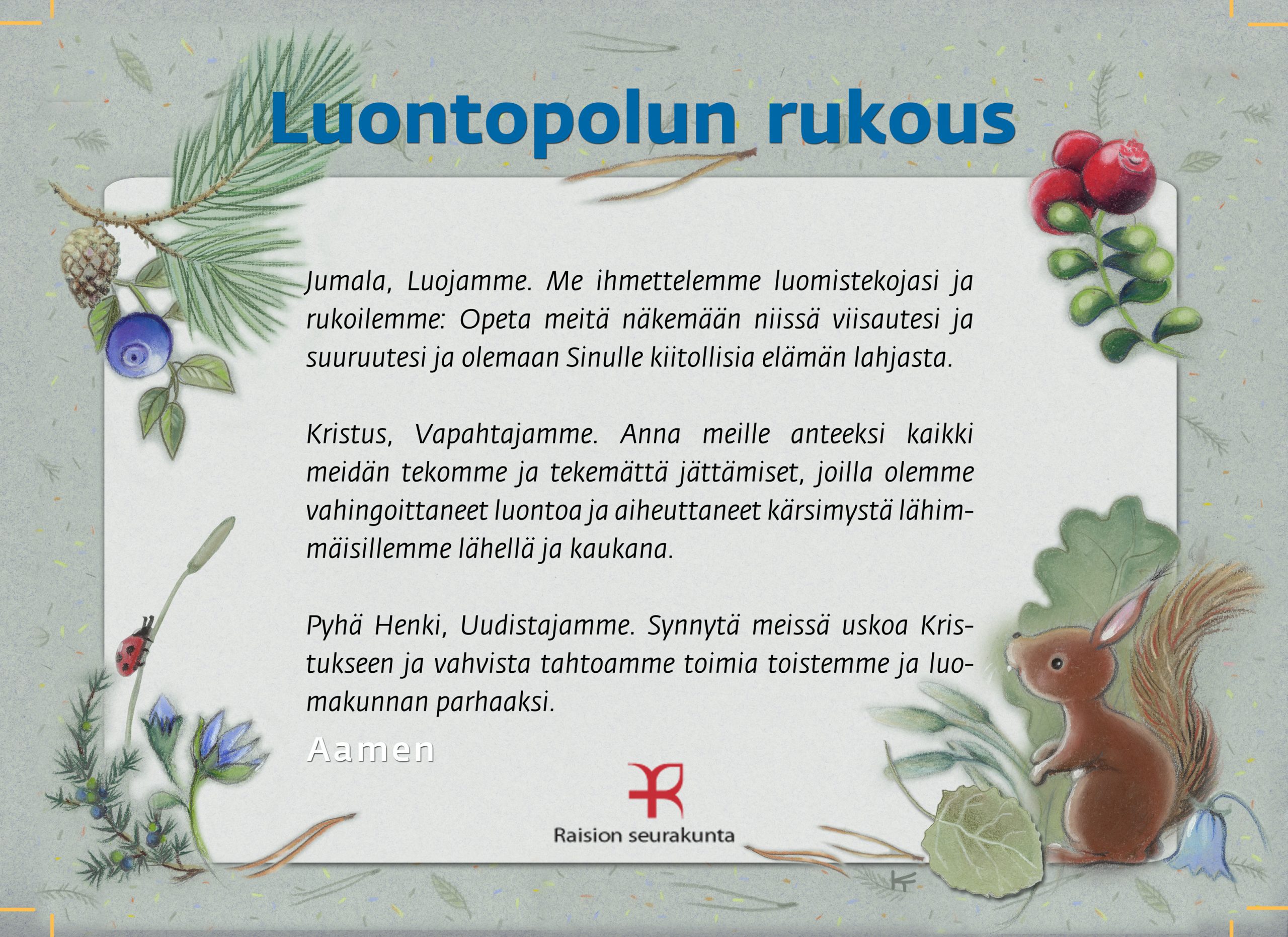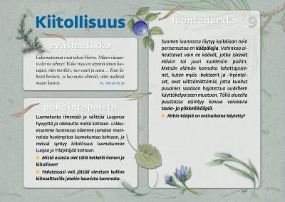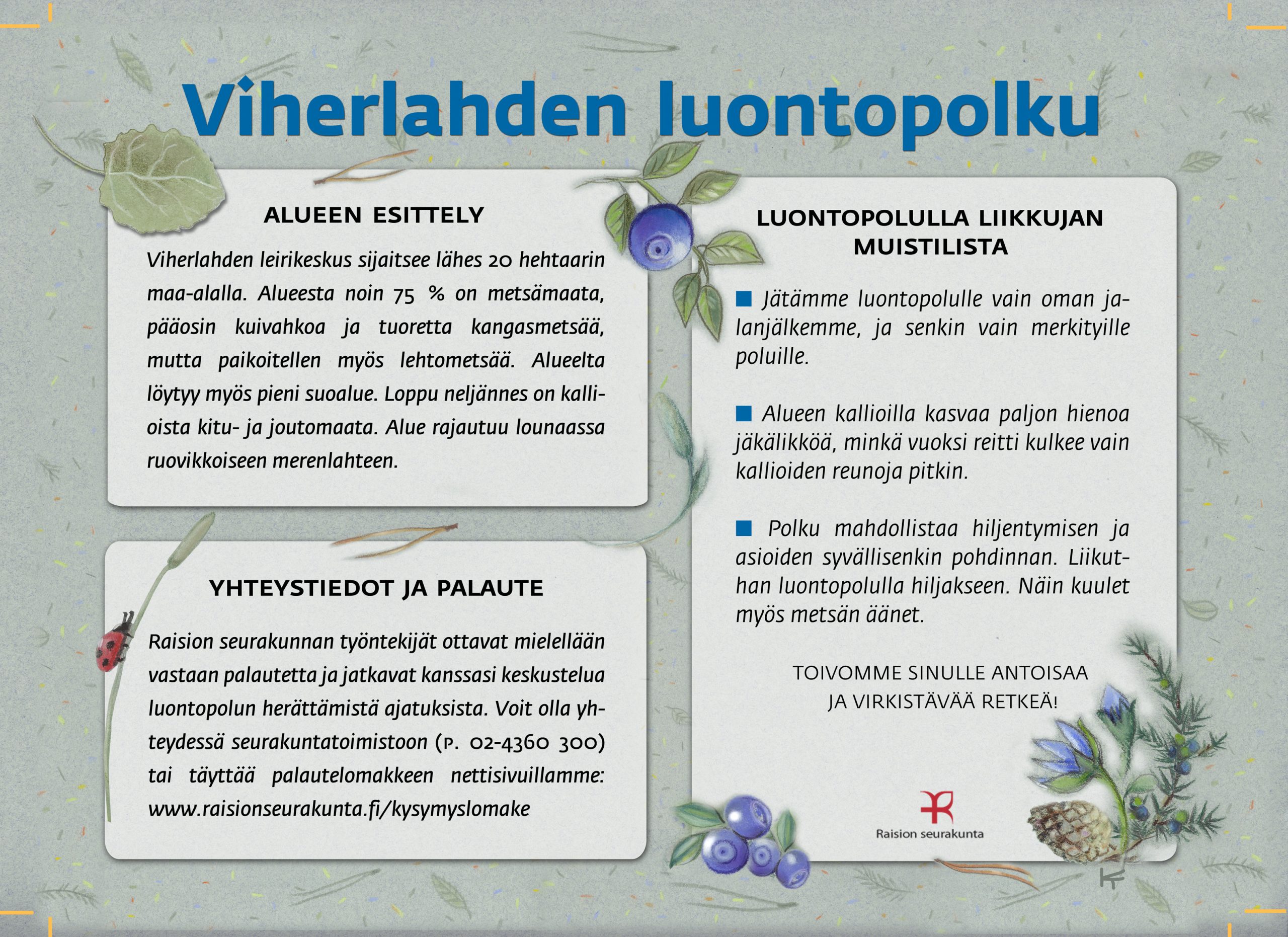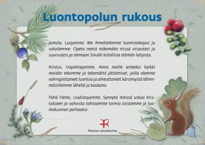 Tämän luontopolun teemat kutsuvat sinua pohtimaan vuorovaikutusta Jumalan, itsesi, toisten ihmisten ja koko luomakunnan välillä. Luontopolku on laadittu Raision seurakunnan leirikeskuksen metsään, mutta luontopolun kuvataulujen tekstejä voit pohtia soveltuvin osin vaikka kotona tietokoneen äärellä hiljentyen. Pohdiskelupolku on saanut Kirkon ympäristökasvatuspalkinnon yhdessä lasten luontopolun kanssa.