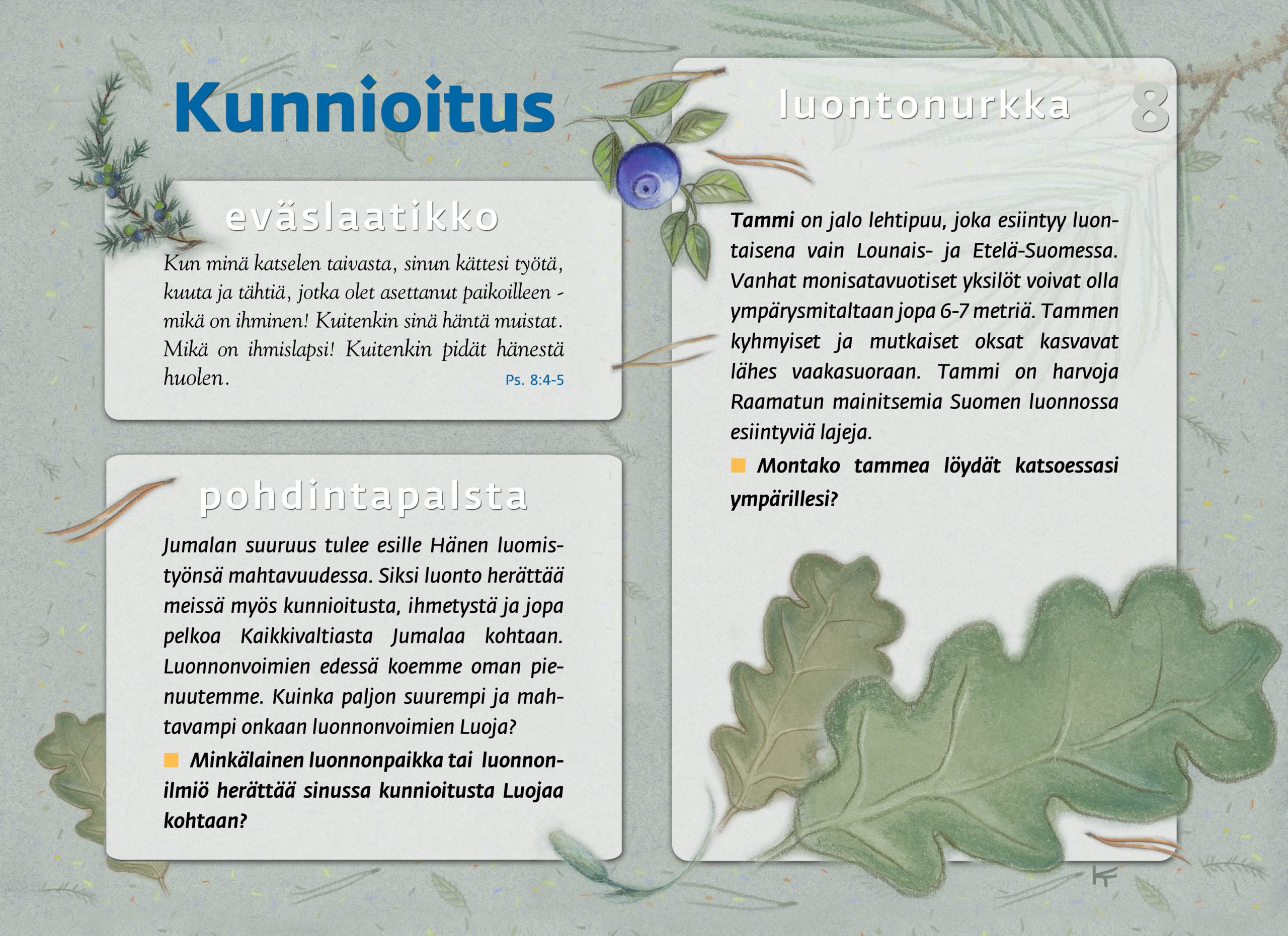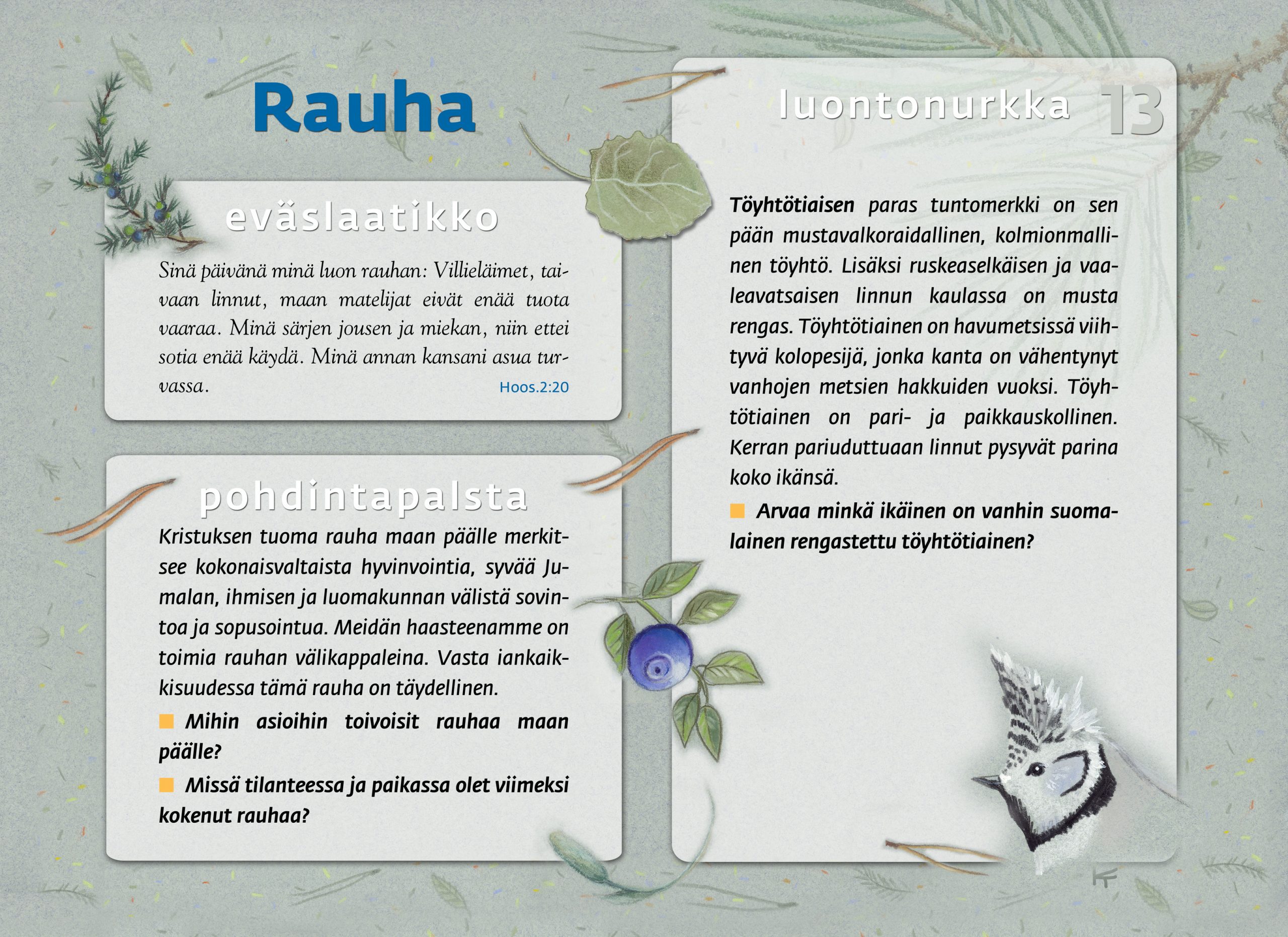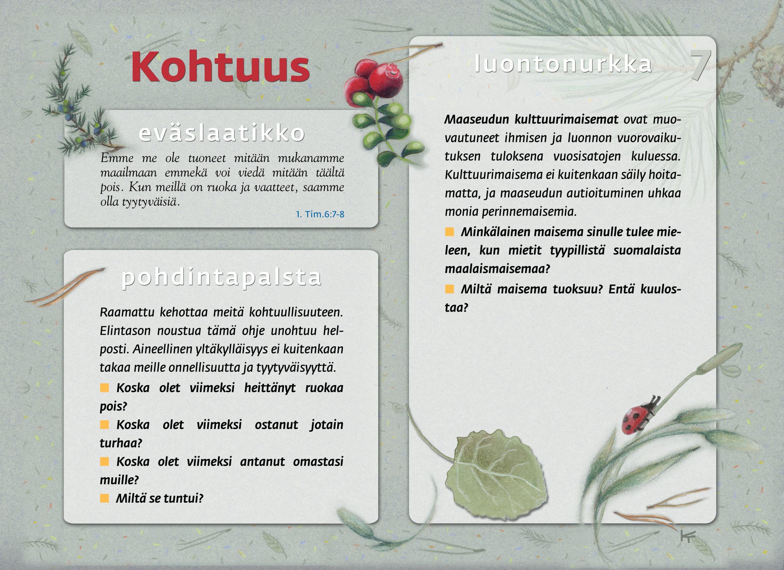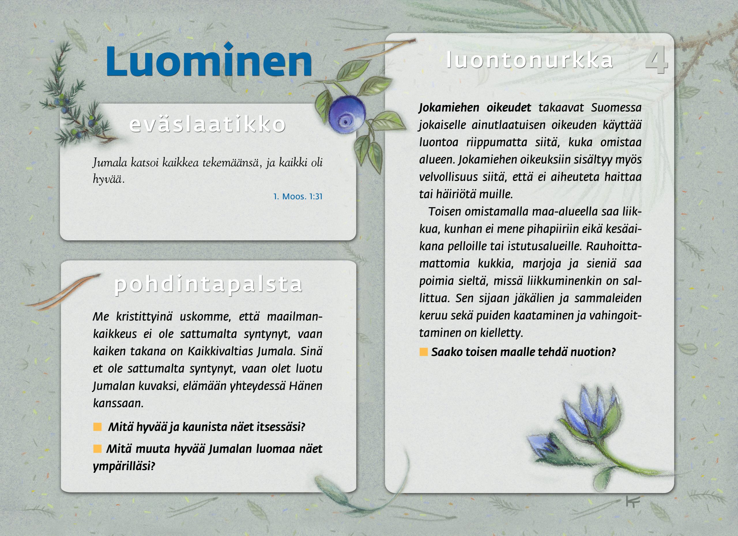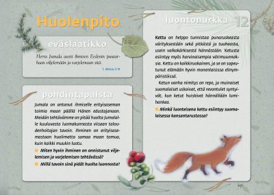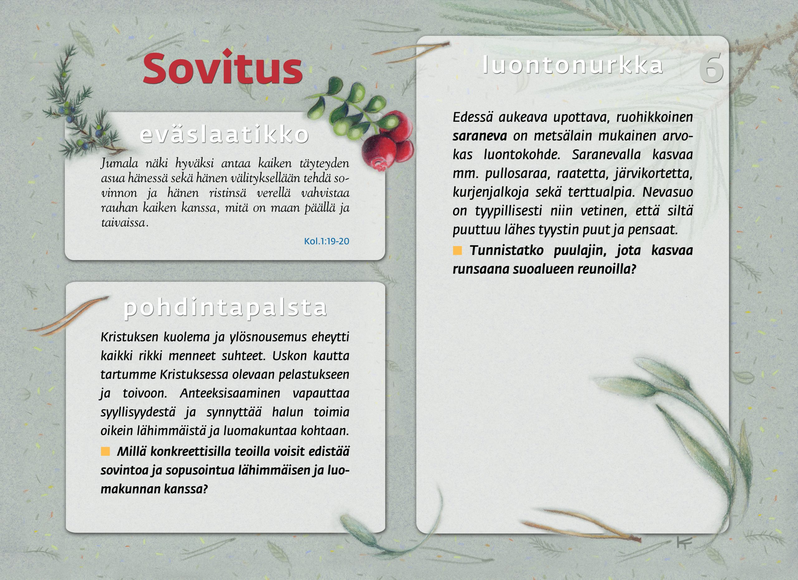 Tämän luontopolun teemat kutsuvat sinua pohtimaan vuorovaikutusta Jumalan, itsesi, toisten ihmisten ja koko luomakunnan välillä. Luontopolku on laadittu Raision seurakunnan leirikeskuksen metsään, mutta luontopolun kuvataulujen tekstejä voit pohtia soveltuvin osin vaikka kotona tietokoneen äärellä hiljentyen. Pohdiskelupolku on saanut Kirkon ympäristökasvatuspalkinnon yhdessä lasten luontopolun kanssa.