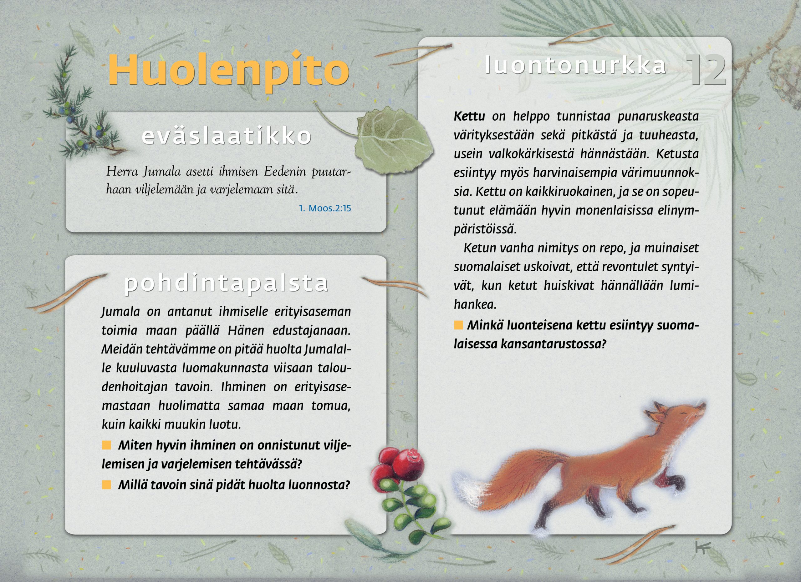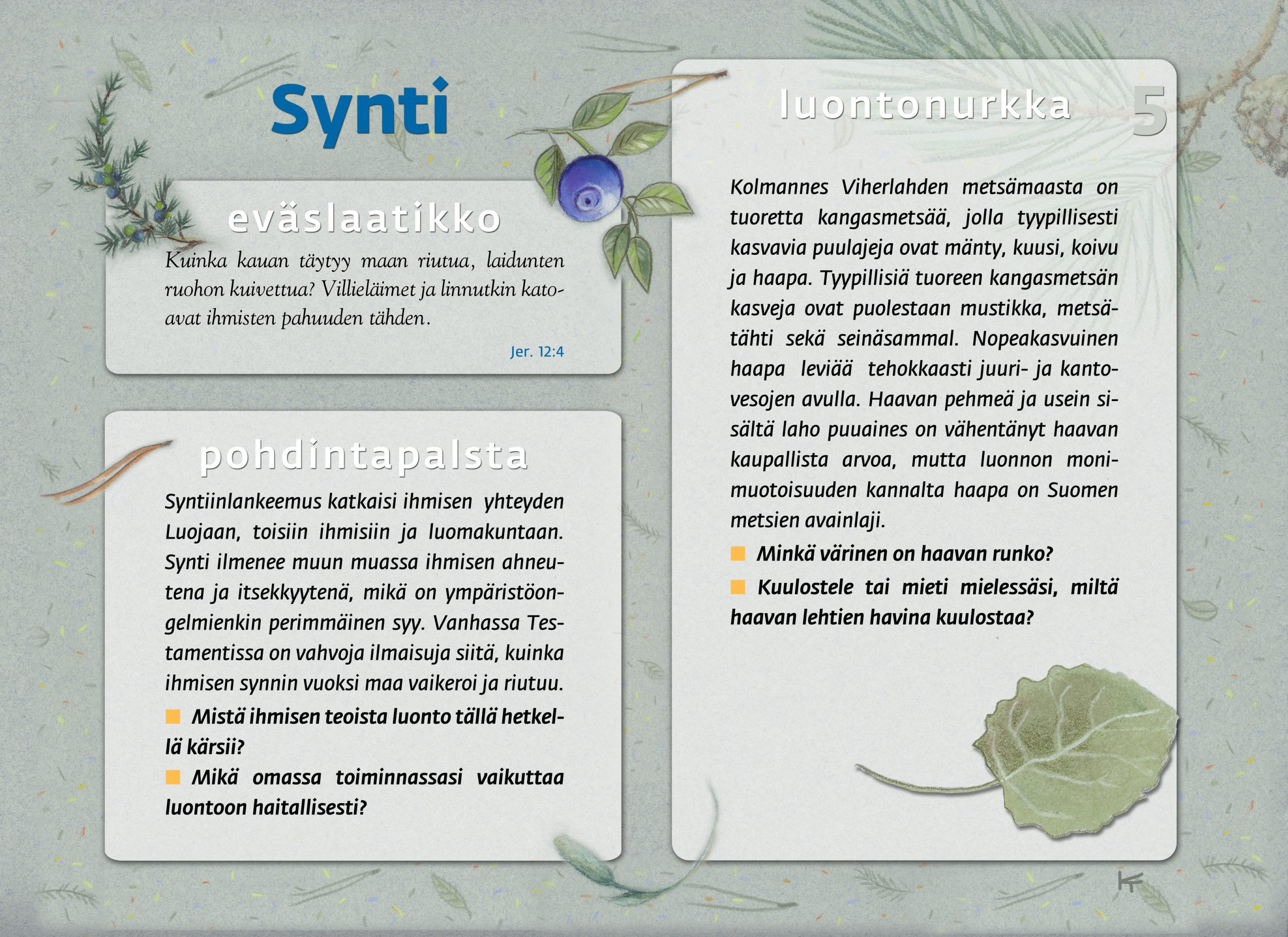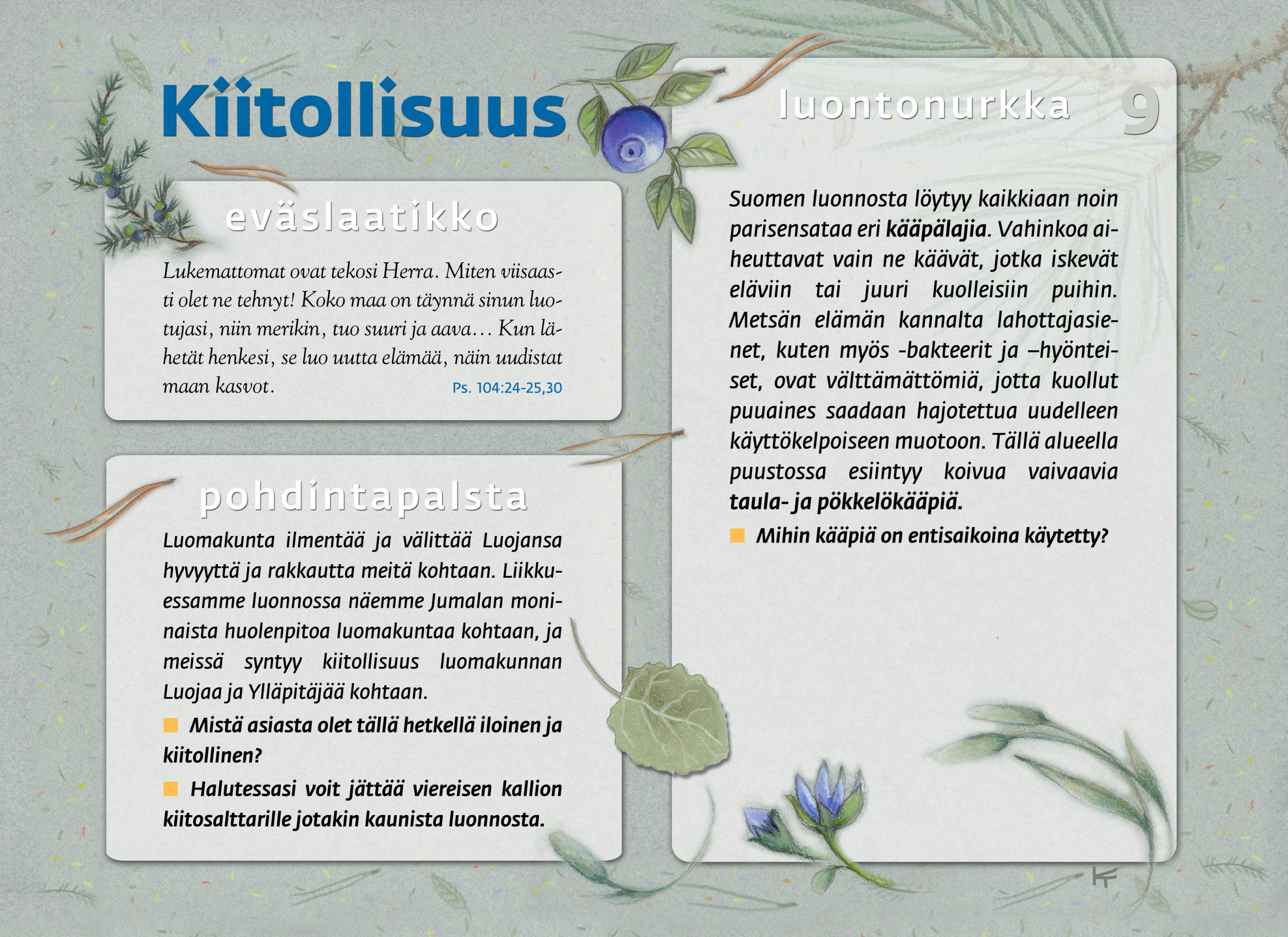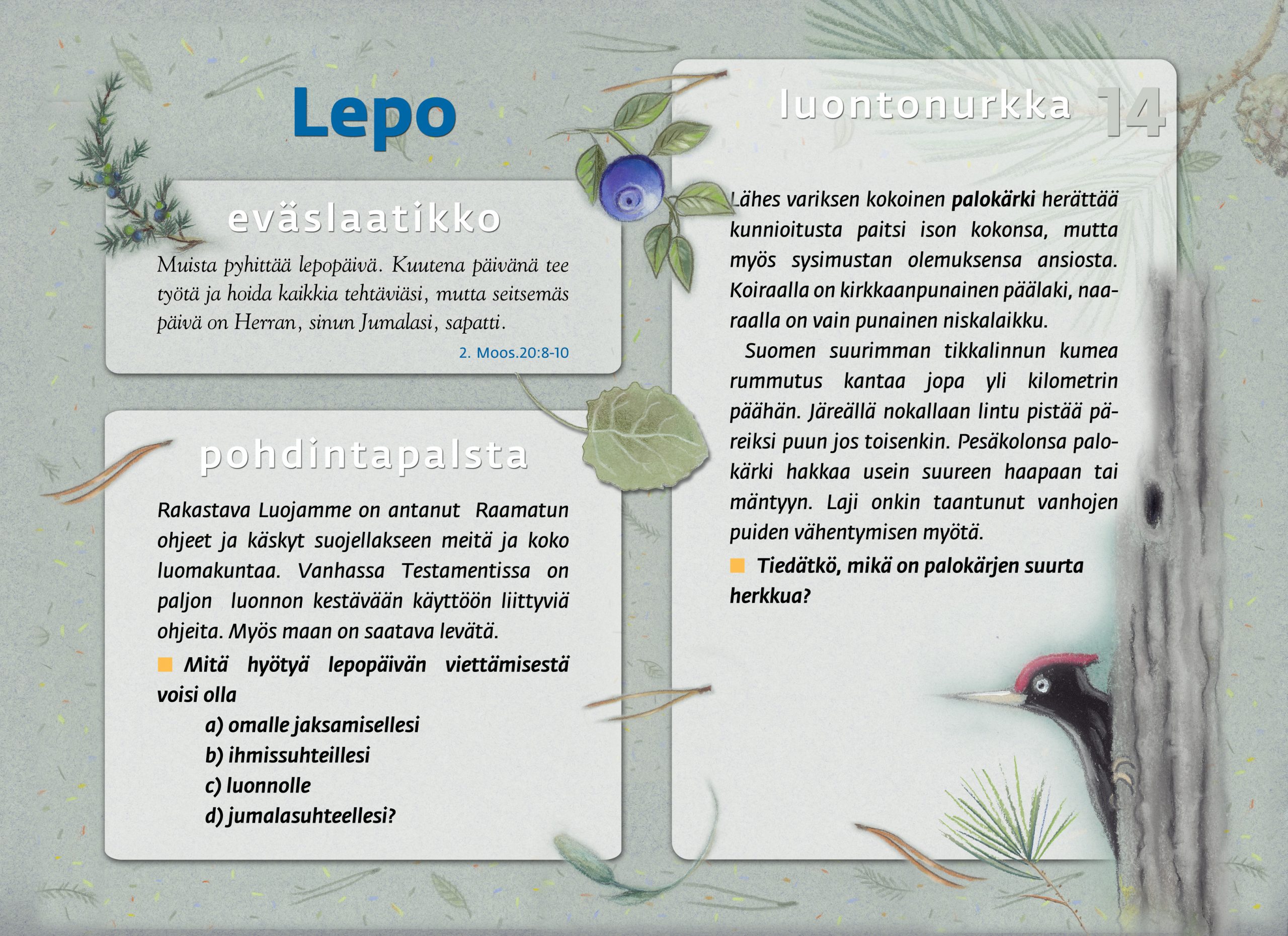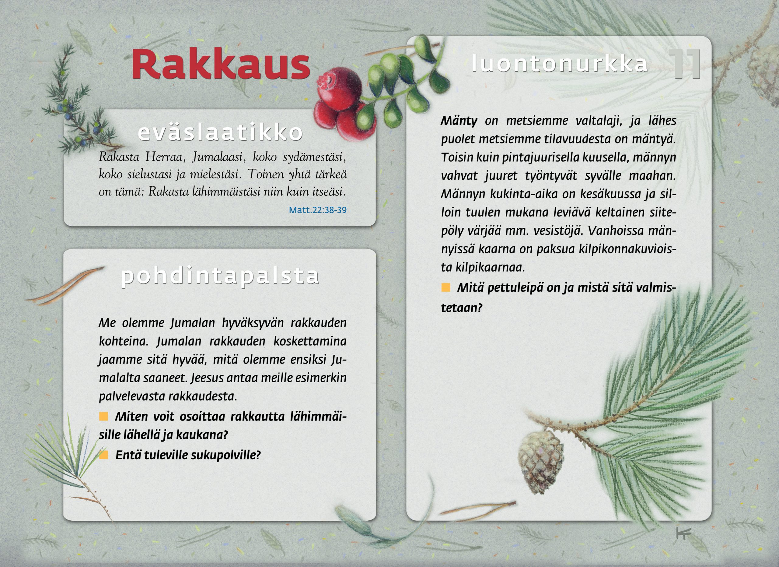 Tämän luontopolun teemat kutsuvat sinua pohtimaan vuorovaikutusta Jumalan, itsesi, toisten ihmisten ja koko luomakunnan välillä. Luontopolku on laadittu Raision seurakunnan leirikeskuksen metsään, mutta luontopolun kuvataulujen tekstejä voit pohtia soveltuvin osin vaikka kotona tietokoneen äärellä hiljentyen. Pohdiskelupolku on saanut Kirkon ympäristökasvatuspalkinnon yhdessä lasten luontopolun kanssa.