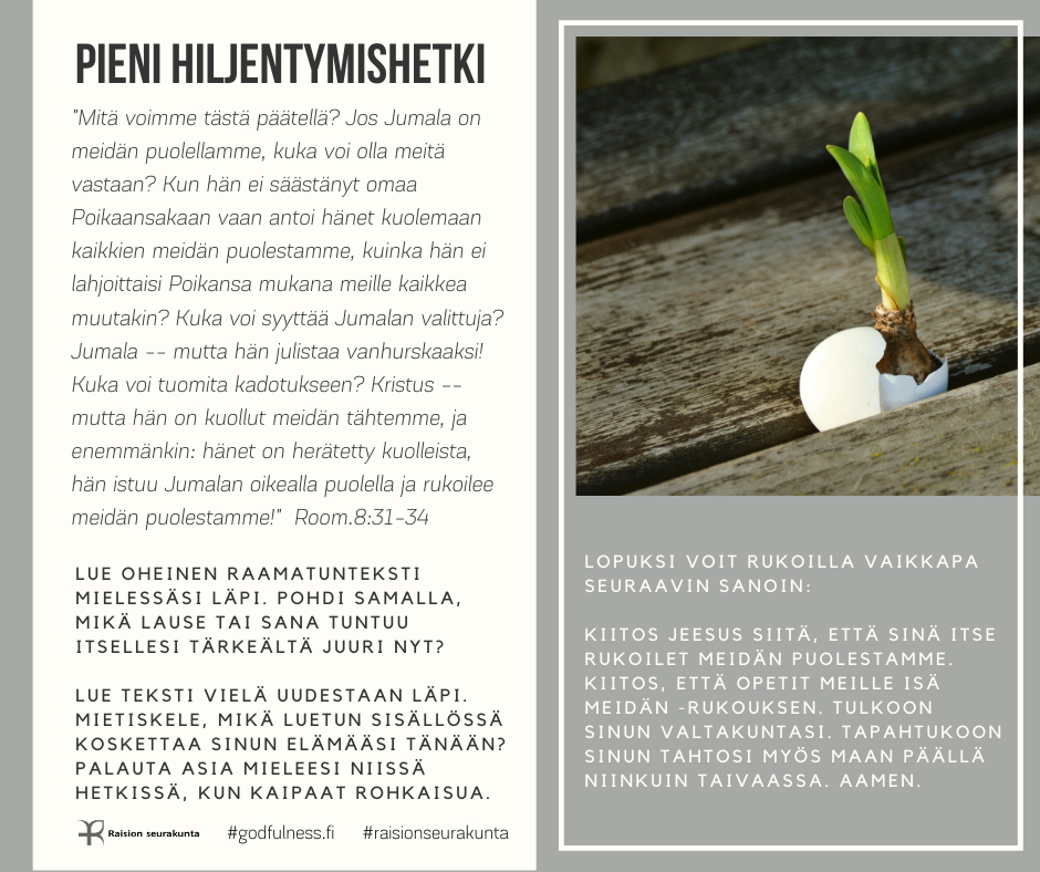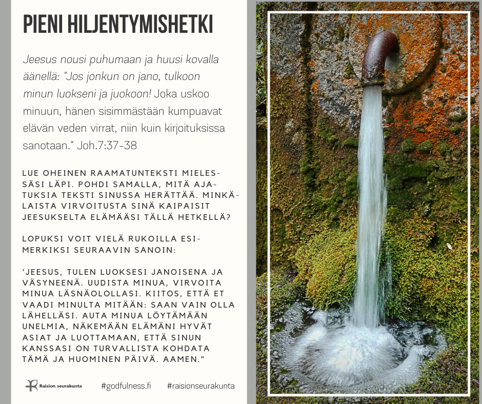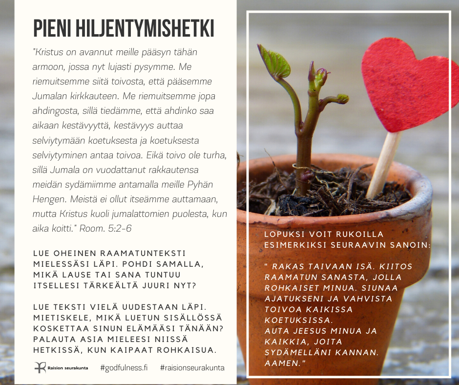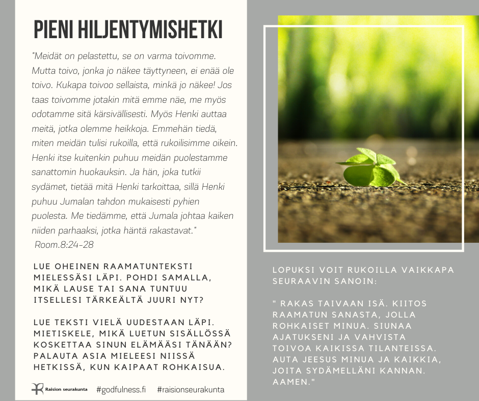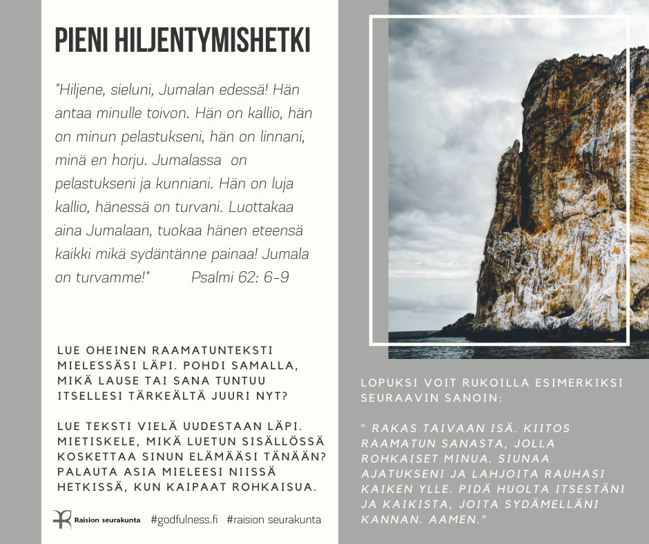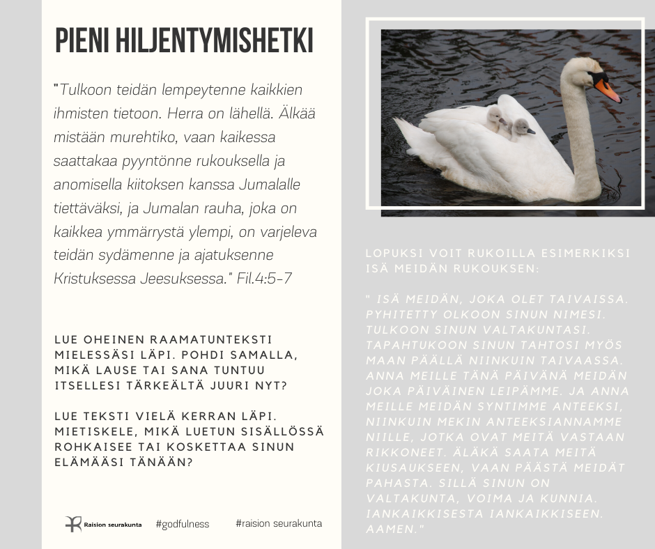 PIENI HILJENTYMISHETKI Pieni hiljentymishetki tarjoaa mahdollisuuden rauhoittua raamatuntekstin mietiskelemisen ja rukouksen avulla. Voit valita sinua kutsuvan kuvan tai puhuttelevan tekstin. Halutessasi voit palata siihen uudestaan myöhemmin.