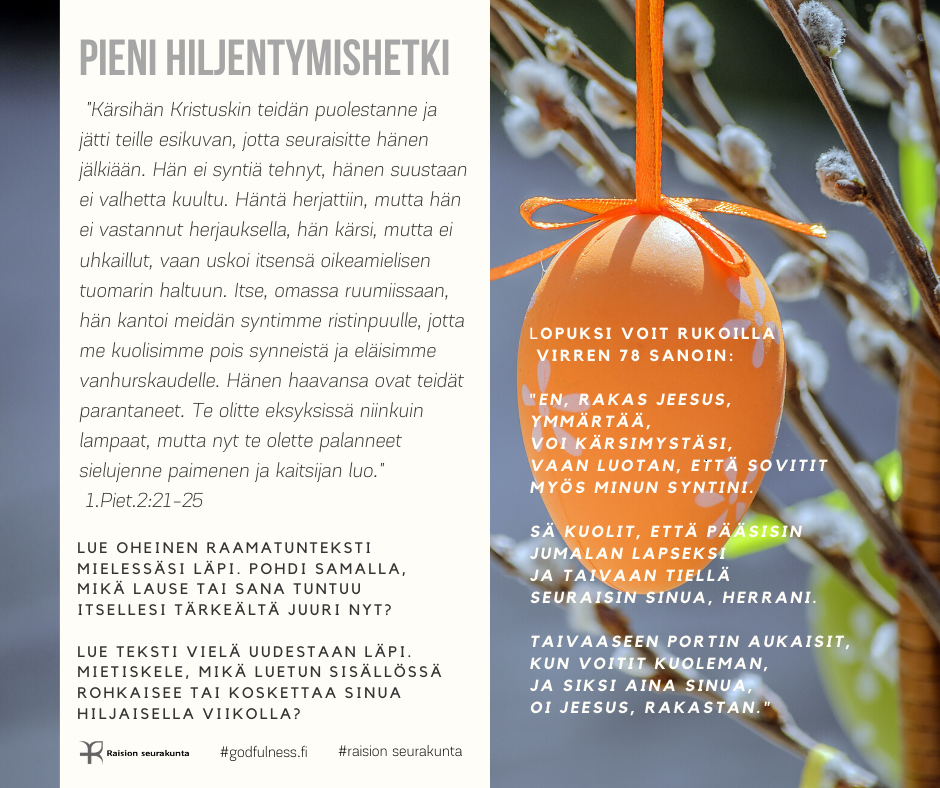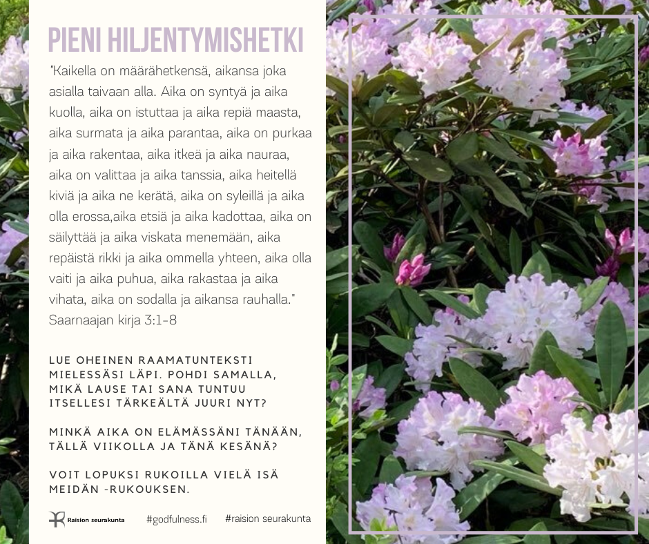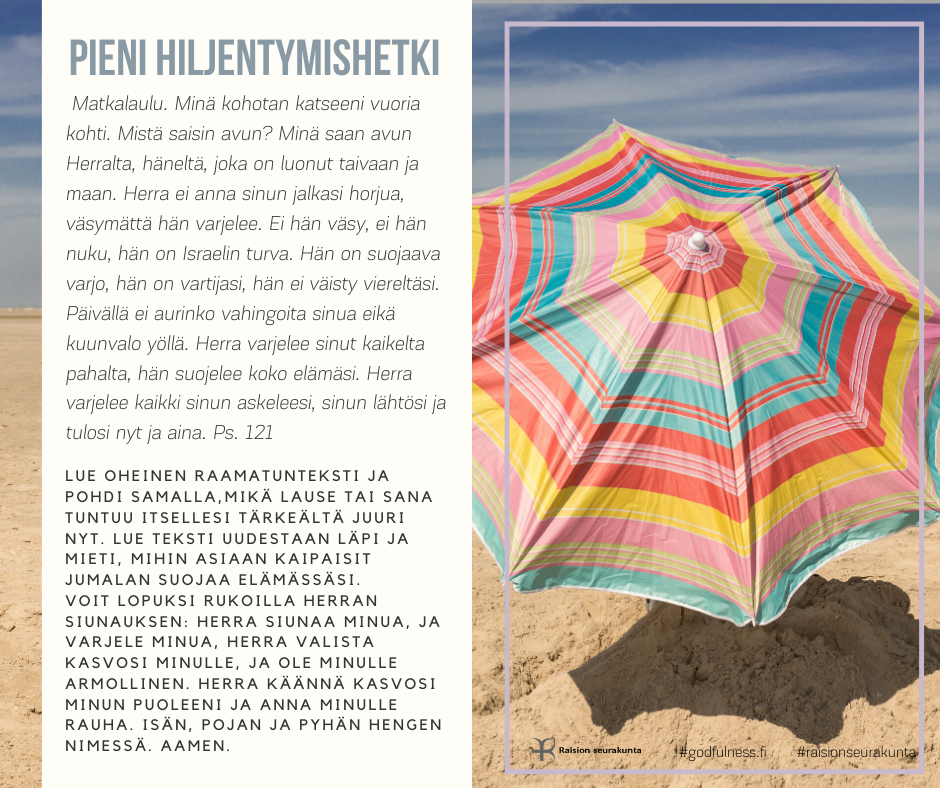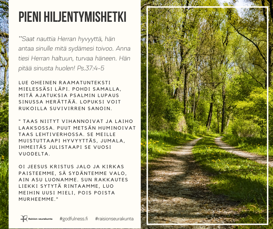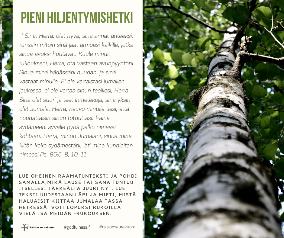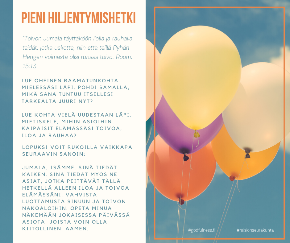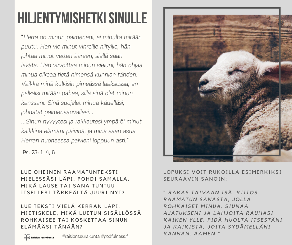 PIENI HILJENTYMISHETKI Pieni hiljentymishetki tarjoaa mahdollisuuden rauhoittua raamatuntekstin mietiskelemisen ja rukouksen avulla. Voit valita sinua kutsuvan kuvan tai puhuttelevan tekstin. Halutessasi voit palata siihen uudestaan myöhemmin.